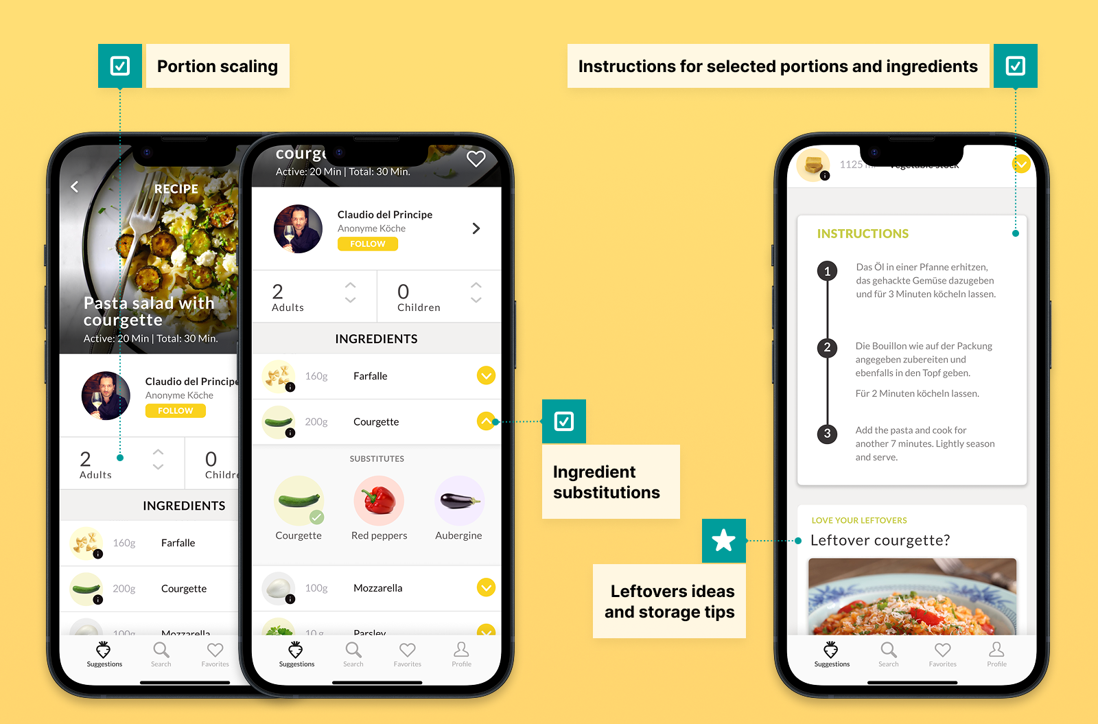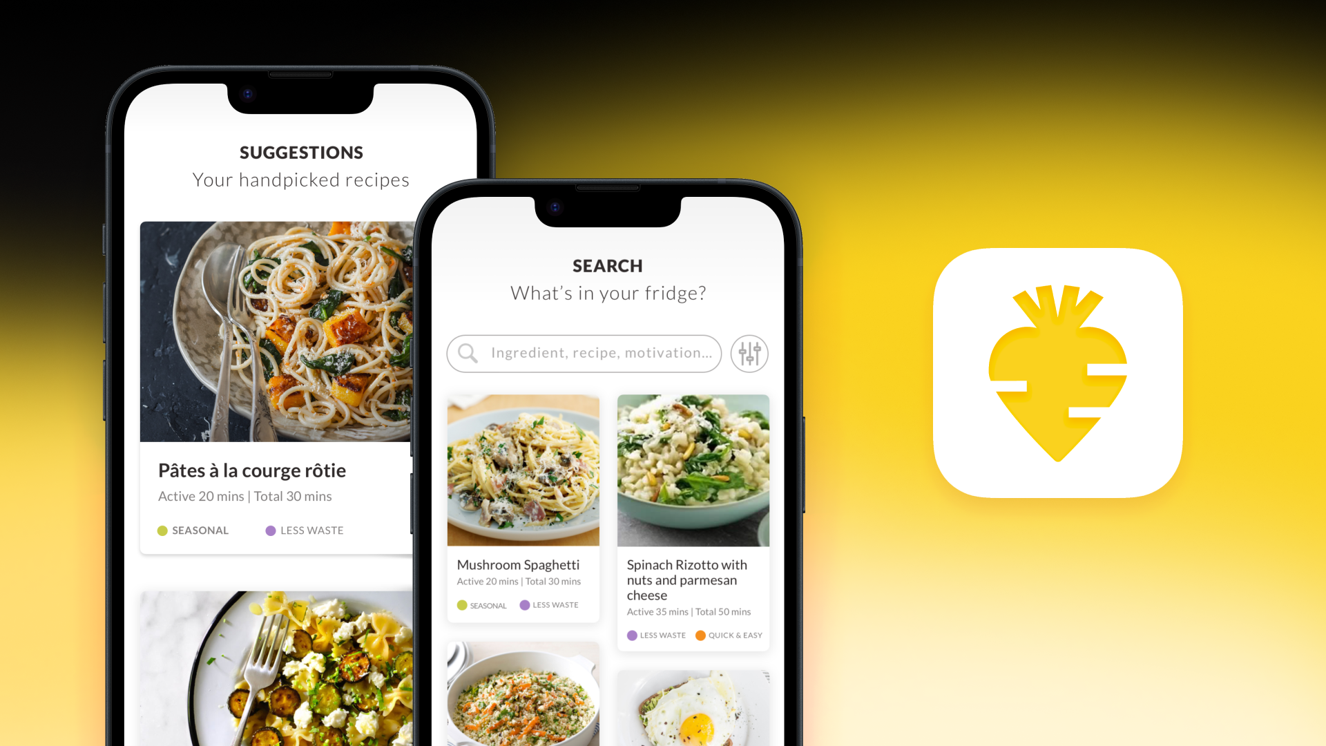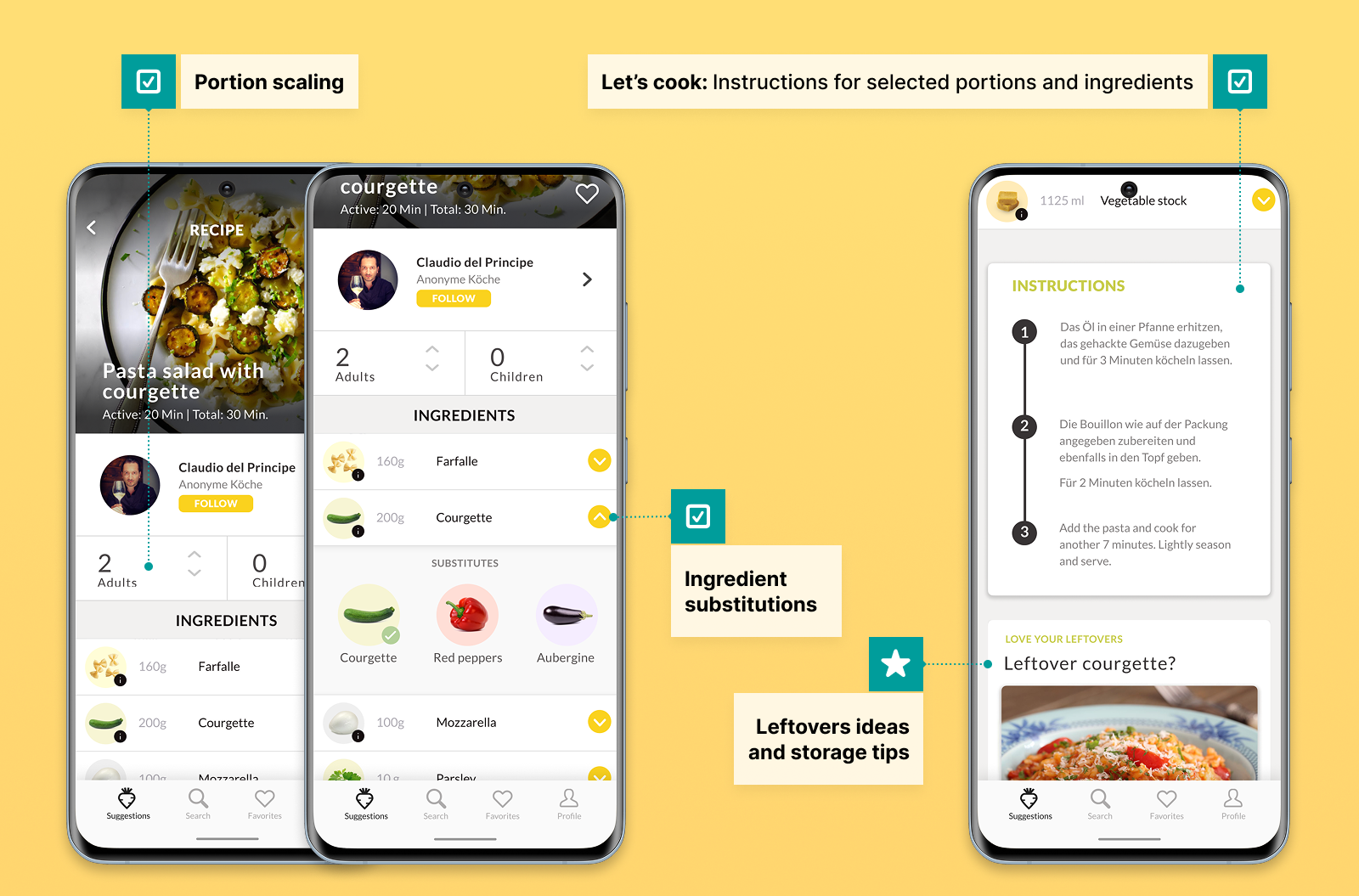● Ingredient swaps appeared via yellow chevrons (spinach → chard → kale), always suggesting sustainable alternatives to reduce food waste and increase accessibility, ensuring more users could cook meals without extra shopping.