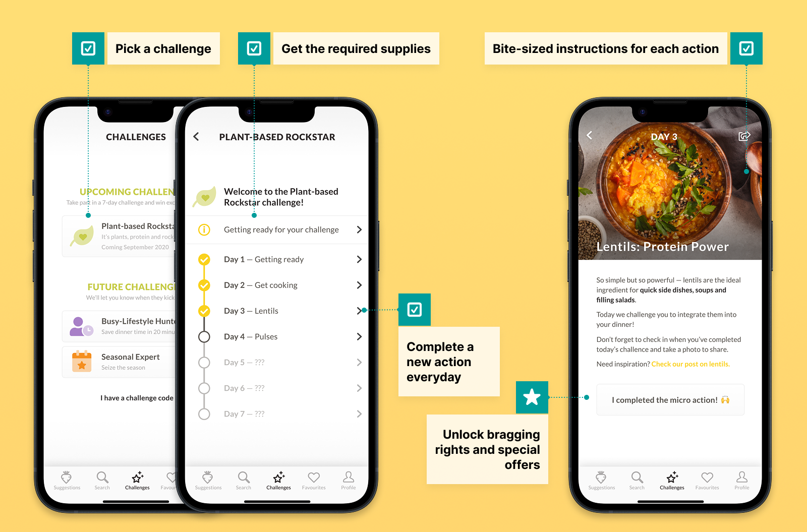Post-launch, I designed progressive challenges to build habits: “No challenge” → pick one → daily check-in → simple celebration. As a result, users remained engaged, experimented with new sustainable recipes, and gradually integrated sustainable practices into their daily routines.