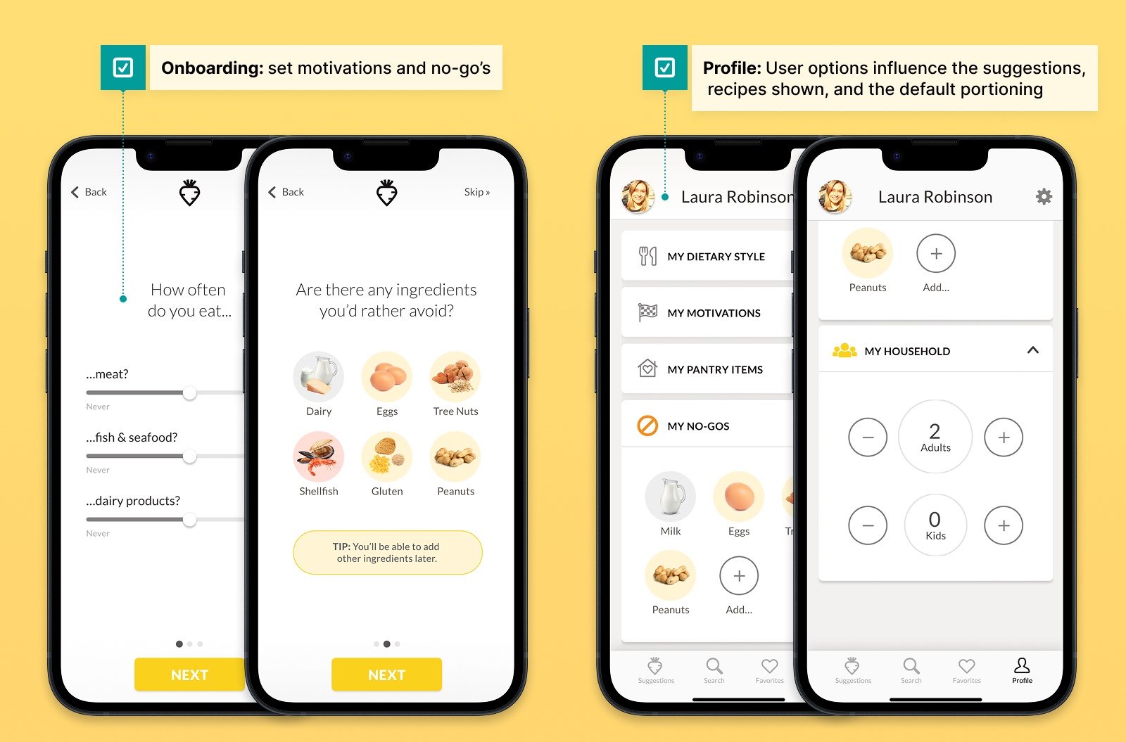● Inclusive language: “Food allergies” → “My no-gos” made profiles accessible beyond medical contexts.
