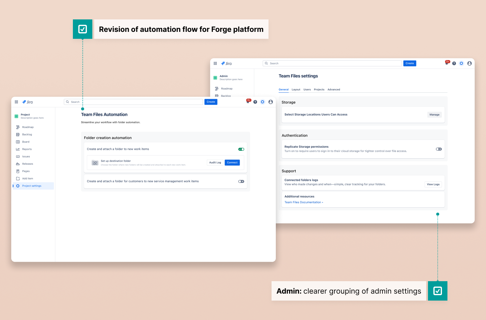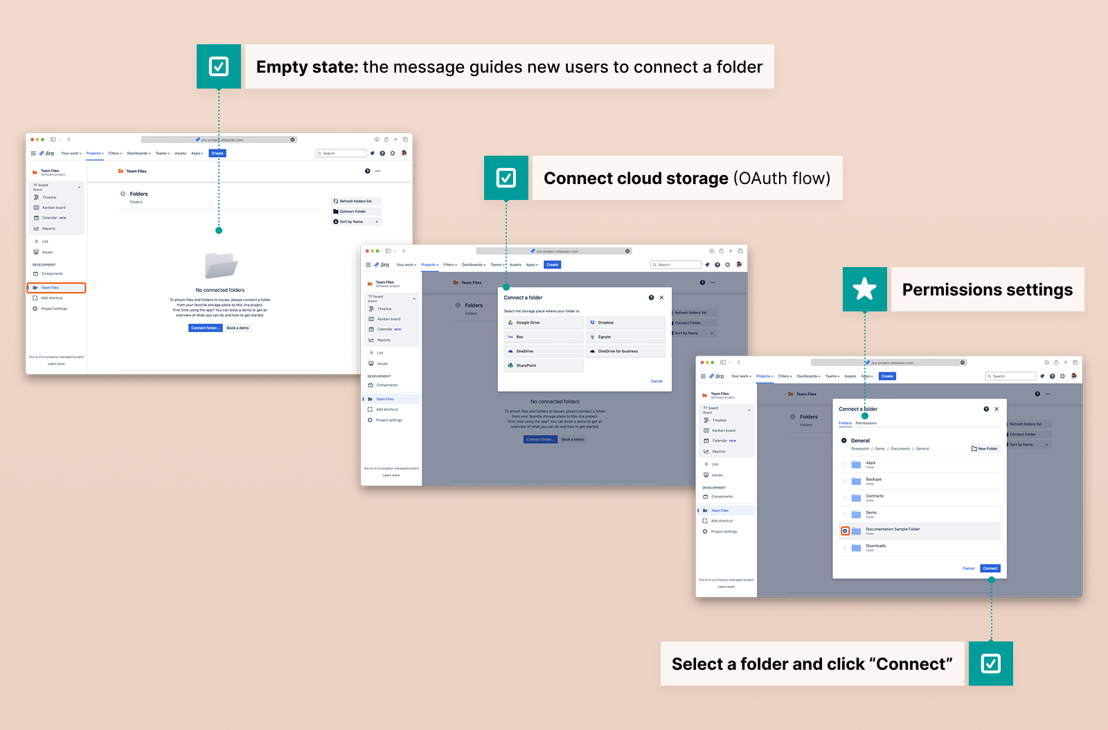● Connecting cloud storage and folders: file manager and connection flows so users could link Dropbox, SharePoint, and others to specific Jira or Confluence projects.