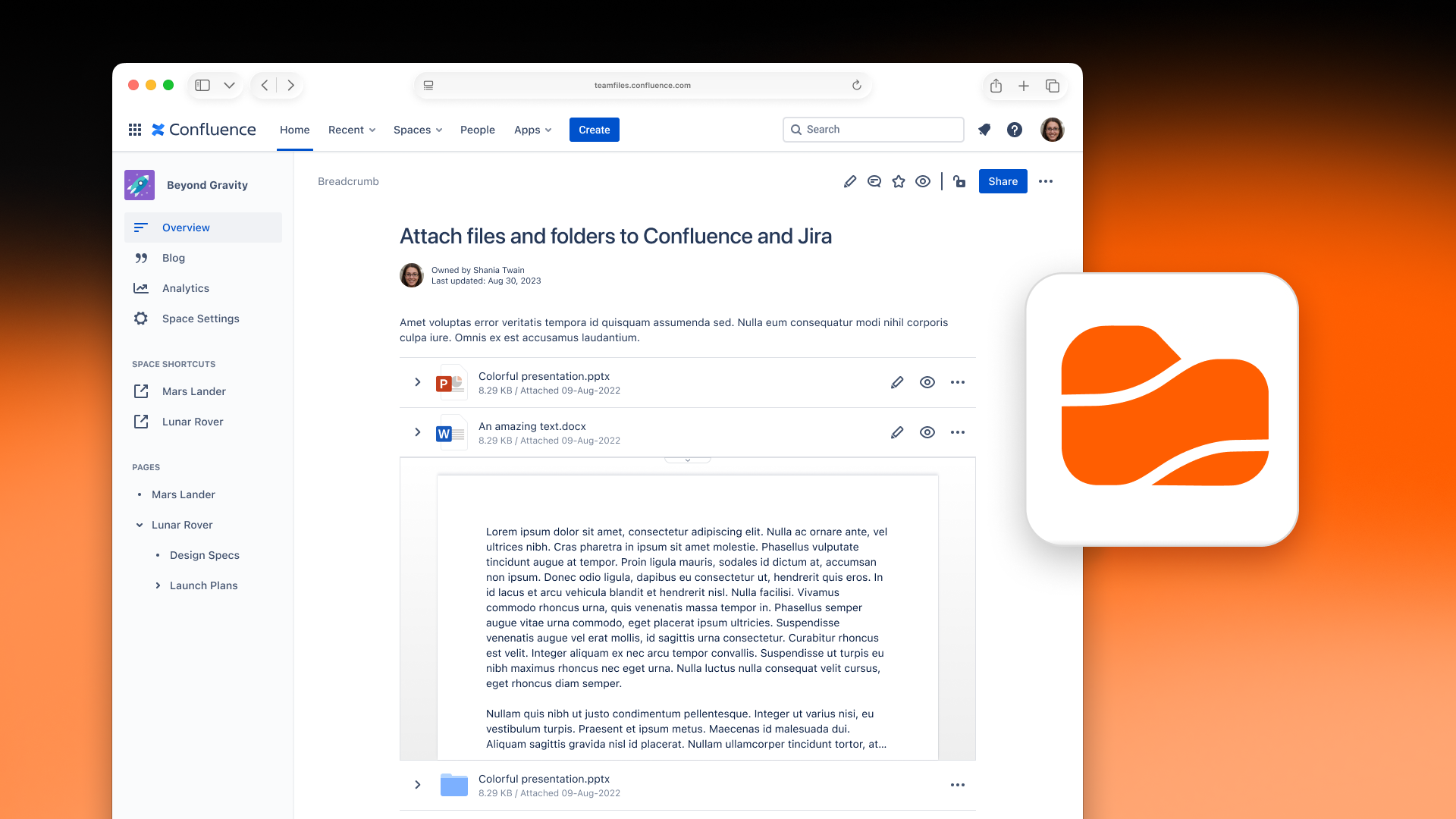 Team Files is an app that connects Jira and Confluence to cloud storage providers like Dropbox and SharePoint, letting teams attach and edit files without creating endless duplicates. Instead of downloading, editing locally, and re-uploading new versions, users can link files and folders directly from their cloud drives and open them with a single click. Updates happen in the original storage, so everyone sees the latest version.