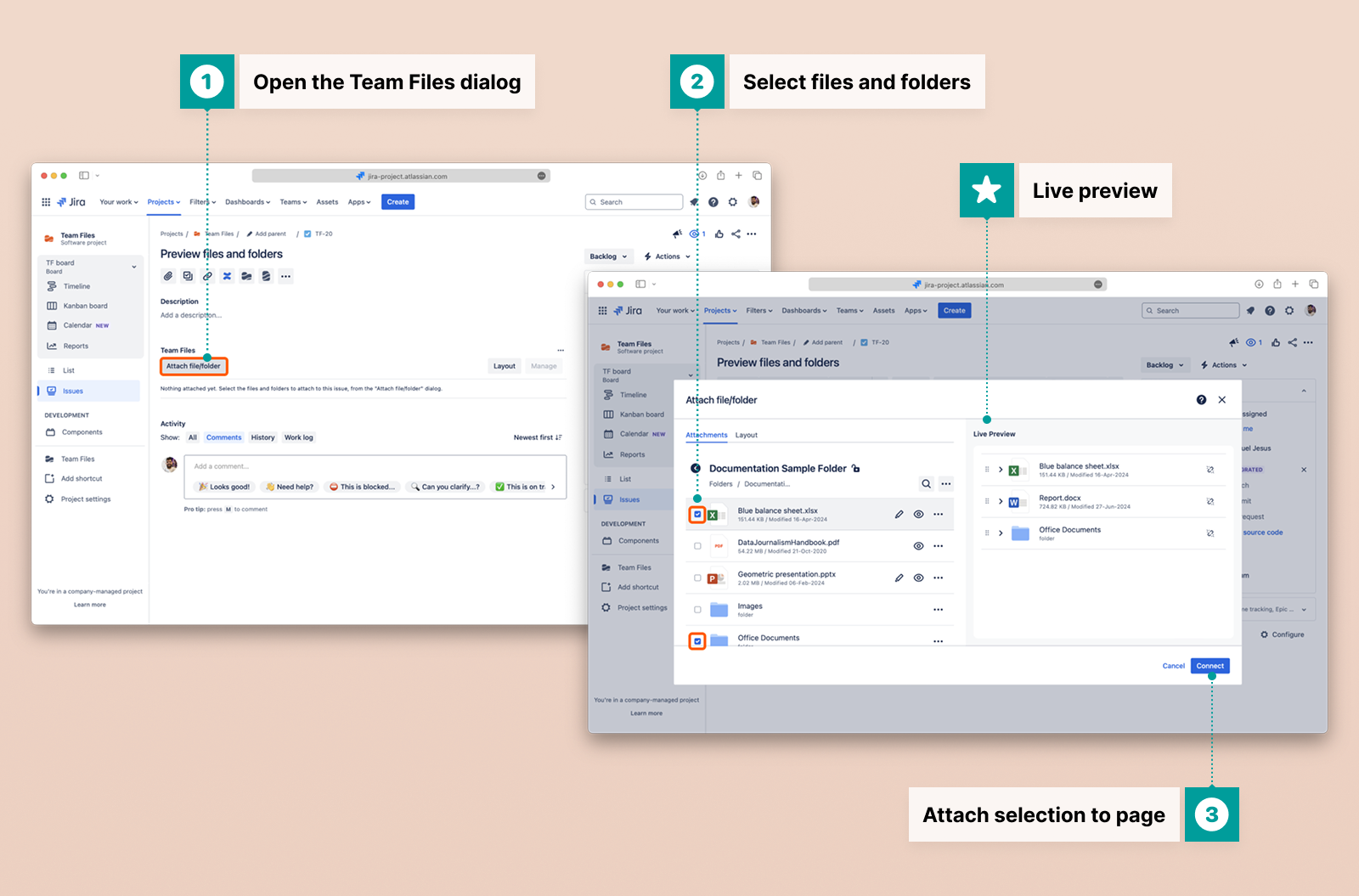 Attach files and folders directly to issues and pages, no more uploads or copies.